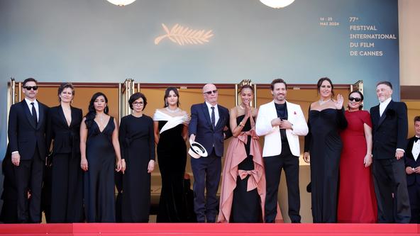 Clément Ducol, la chanteuse Camille, Adriana Paz, Rachida Dati, Selena Gomez, Jacques Audiard, Zoe Saldaña, Édgar Ramírez, Karla Sofía Gascón, Léa Mysius et Damien Jalet. (Cannes, le 18 mai 2024.)Getty Images