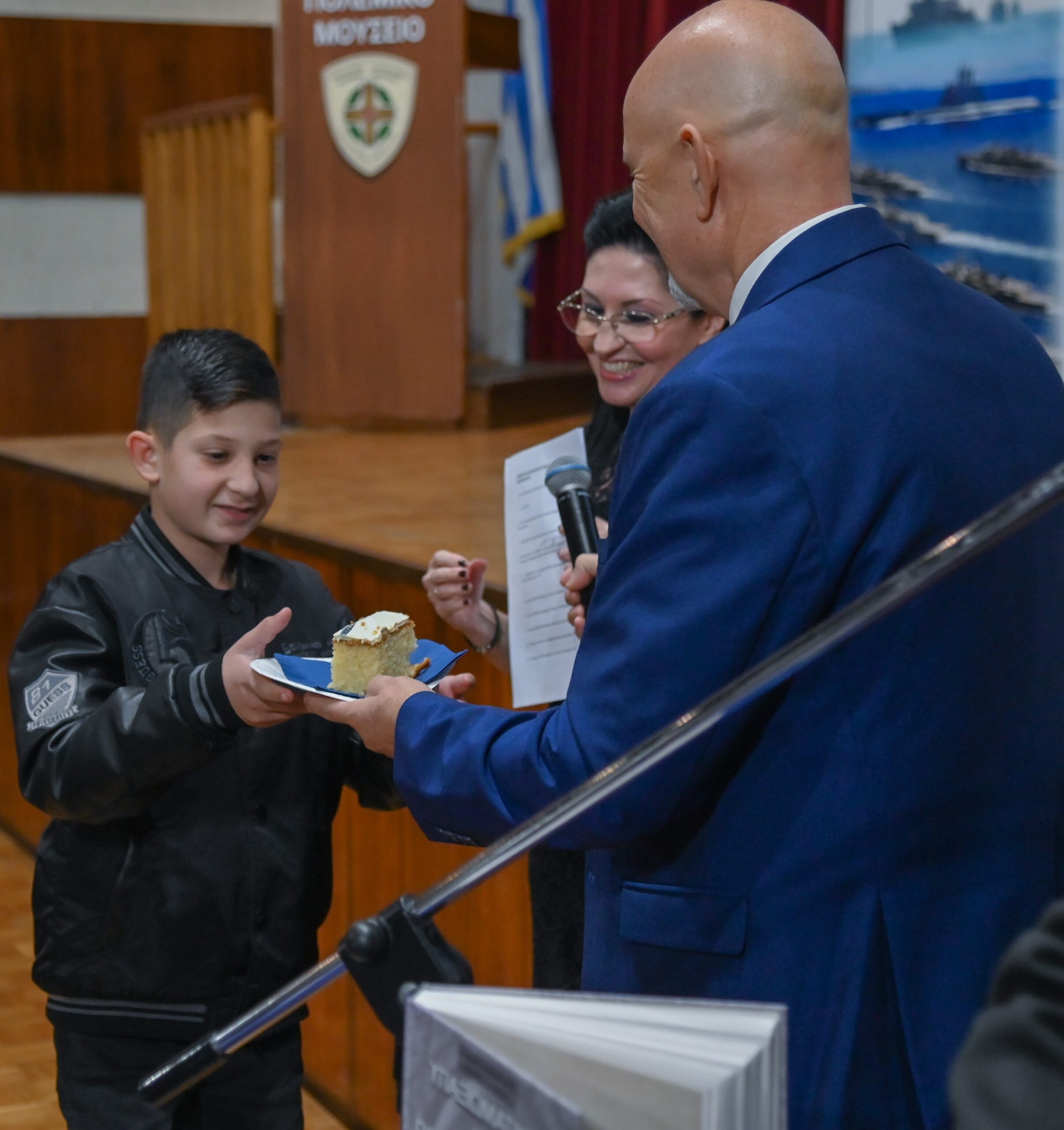 Ο Υπεύθυνος Δημοσίων Σχέσεων του ΣΑΣΜΥΝ Υποπλοίαρχος (Ε) ε.α. Γεώργιος Μαρνελάκης ΠΝ και ο Υπεύθυνος Νομικών & Διοικητικών θεμάτων Πλωτάρχης (Ε) ε.α. Γεώργιος Αλεξανδράκης ΠΝ χάρισαν σε κάθε παιδί της Χορωδίας από ένα Ιστορικό Ναυτικό παραμύθι, της Συγγραφέως Ερευνήτριας Ναυτικής Ιστορίας κυρία Κρίστυ Εμίλιο Ιωαννίδου κι επέδωσαν Επαίνους στην κ. Μάσκα και τον κ. Τσακόπουλο.