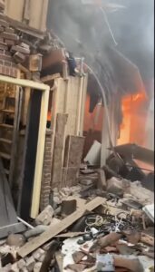 Κάτοικοι μιλούν για έναν δυνατό κρότο που ακούστηκε σε μεγάλη απόσταση, με το ωστικό κύμα να σπάζει τζάμια και να μετατρέπει τον δρόμο σε πεδίο καταστροφής μέσα σε δευτερόλεπτα. Αμέσως μετά, πυκνοί καπνοί σκέπασαν την περιοχή, ενώ ξέσπασε φωτιά σε τουλάχιστον ένα κτίριο.