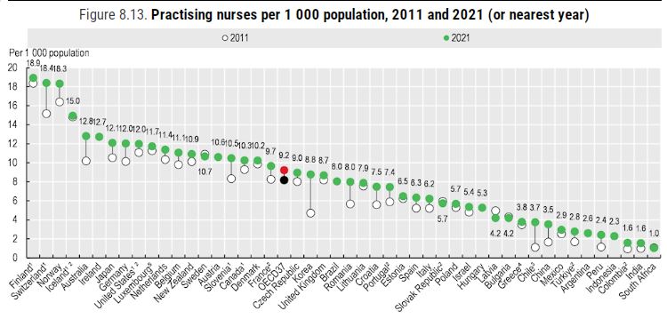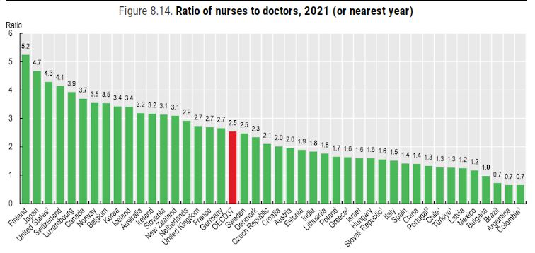 Σε αναλογία νοσηλευτών προς γιατρούς, η Ελλάδα βρίσκεται στις τελευταίες θέσεις μεταξύ των χωρών του ΟΟΣΑ (1,6 νοσηλευτές προς 1 γιατρό)