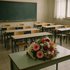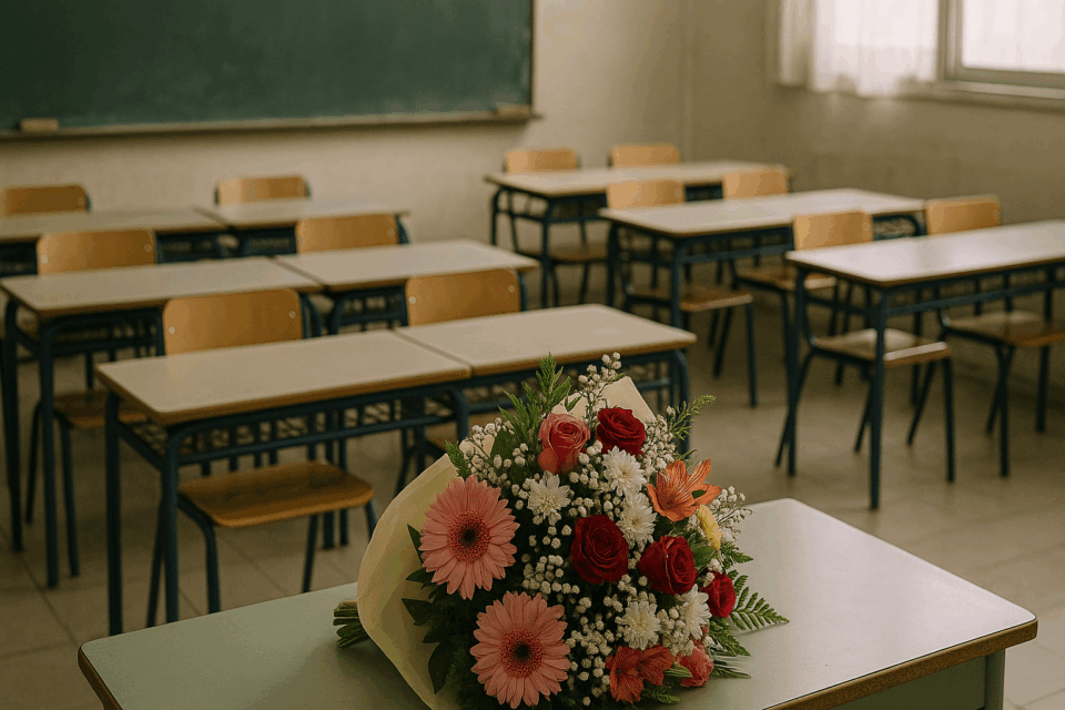 Αντί αποχαιρετισμού, οι μαθητές της αφήνουν λουλούδια στην τάξη όπου δίδαξε για τελευταία φορά.